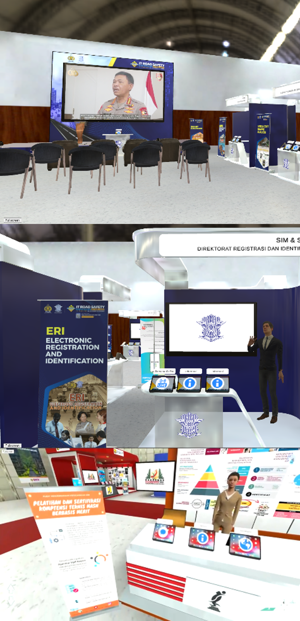 Virtual tour menggunakan dunia maya sebagai tempat diadakannya event atau exhibition layaknya metaverse. Pada virtual tour ini, pengunjung dapat berinteraksi dengan tiap booth yang ada. Setiap booth dapat menampilkan informasi interaktif berupa gambar, text, audio, video, begitu juga live video (melalui youtube). Virtual booth ini juga dilengkapi dengan fitur integrasi zoom, sehingga dapat dilakukan sebuah seminar virtual.